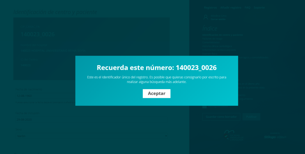 4. Cuando se genera el registro, se crea un identificador único que se muestra en pantalla. Este identificador puede consignarse en otro tipo de documentación y permitirá volver a él fácilmente en futuras búsquedas.