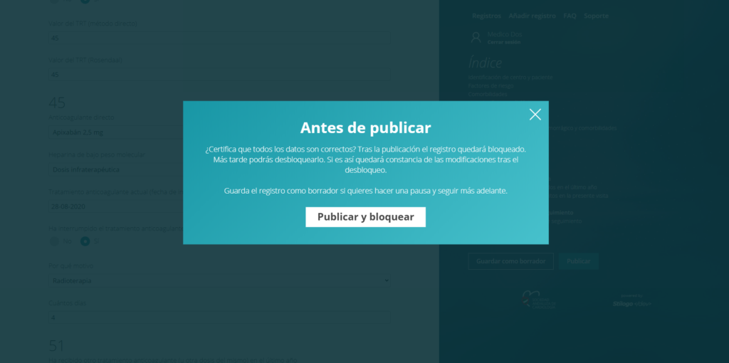 5. Desde el momento en que se crea el registro, ya se puede proceder a editarlo. Los registros admiten guardarse en modo borrador y recuperarse en sucesivas sesiones para continuar editándolos. Existe, asimismo, una utilidad de autoguardado. Debido a la extensión de este cuaderno de recogida de datos (18 secciones), tuvimos que desarrollar un índice de contenidos que facilitara la navegación por los distintos bloques.
