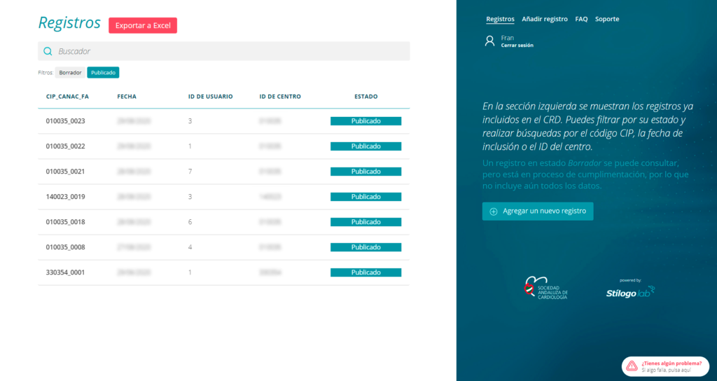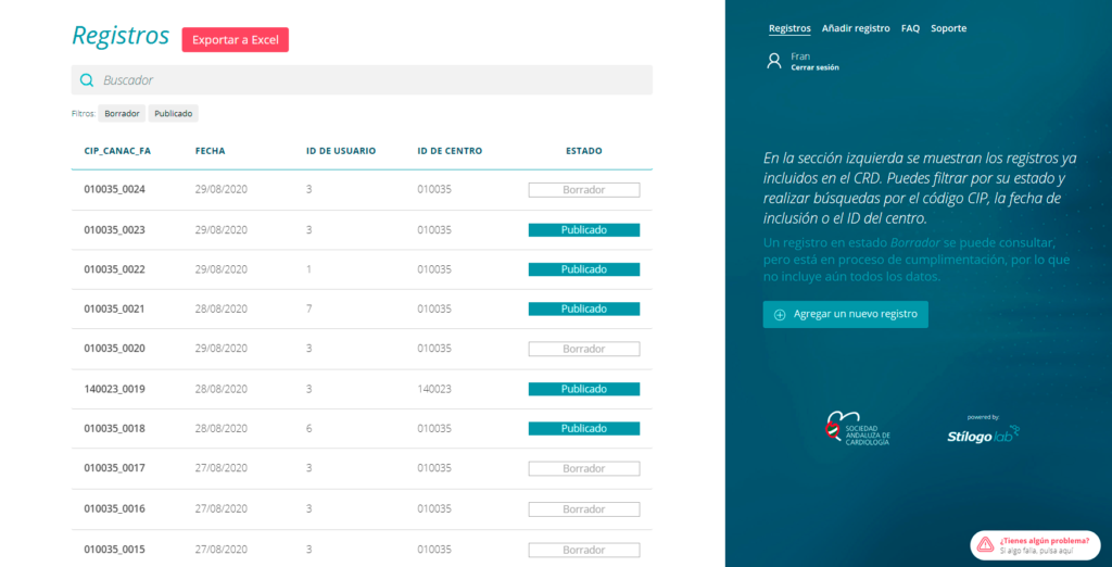 8. Los registros pueden filtrarse por diversos valores, como código de identificación, fecha, ID de usuario, ID de centro y estatus. El administrador del CRD puede exportar los valores de los registros a Excel para su análisis estadístico.