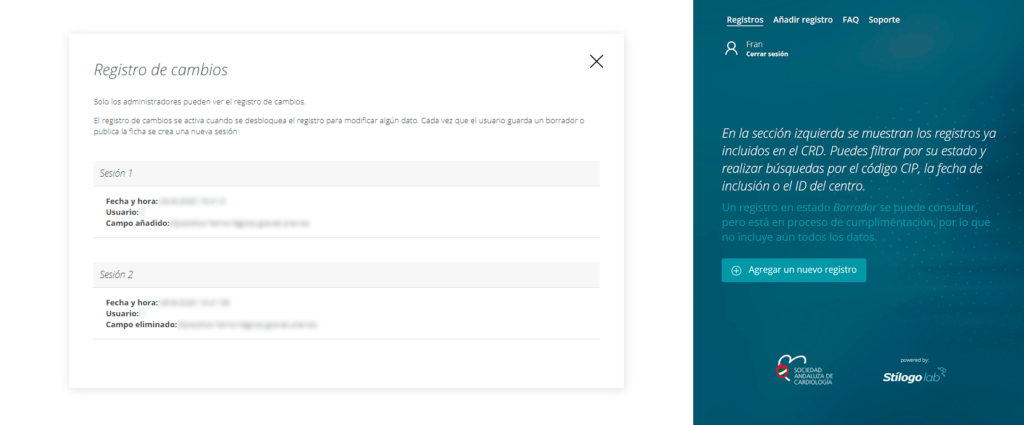 9. En el cuaderno de recogida de datos se consignan todas las modificaciones que se llevan a cabo, y el usuario administrador dispone de privilegios para acceder al registro de cambios.