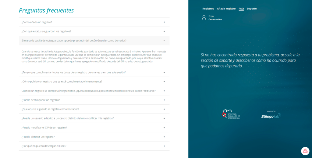 10. El CRD incluye una completa sección FAQ para los editores de los registros clínicos y la posibilidad de remitir consultas de soporte desde la propia herramienta.