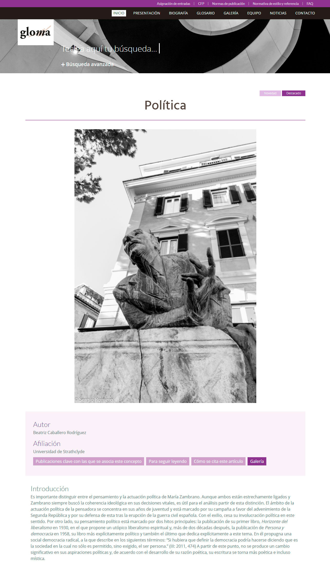 3 octubre, 2019 / 09:53GloMa es uno de nuestros desarrollos más destacados de 2019. Se trata de un glosario terminológico en línea que clarifica las palabras clave del pensamiento zambraniano. Los términos los analizan especialistas en la filósofa malagueña y se representan con fotografías creadas expresamente para ilustrar cada concepto. El propósito de este proyecto es compilar una obra colaborativa de referencia que haga más accesible el pensamiento de María Zambrano y que invite al visitante a desentrañar la potencialidad de su racionalidad.